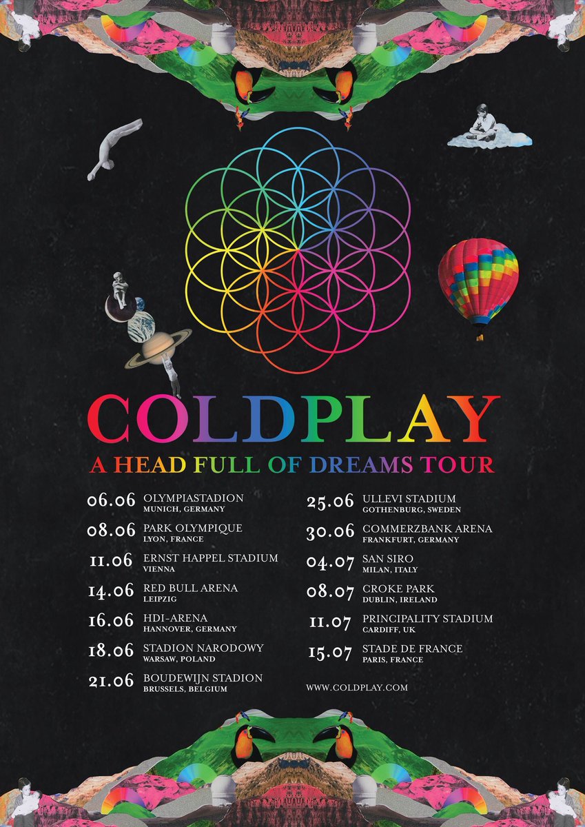 C’est officiel ! Coldplay vient de dévoiler les dates de la deuxième partie de leur A Head Full Of Dreams Tour. Après un passage unique en France l’an dernier à Nice, les Anglais sera à Lyon (Parc OL) le 8 juin 2017, et à Saint-Denis (Stade de France) le 15 juillet 2017. A noter qu’il y aura une prévente clients American Express du mardi 4 octobre 10h au jeudi 6 octobre 10h, avant la mise en vente générale le 7 octobre à partir de 10h !