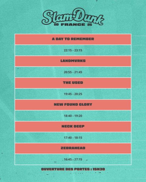 Ça y est ! Le Slam Dunk France pointe enfin le bout de son nez pour cette troisième édition à Lyon. Du côté de nos représentants, on retrouvera notamment Neck Deep. Ils seront accompagnés de A Day To Remember, Landmvrks, New Found Glory, The Used et Zebrahead. Voici les horaires :
