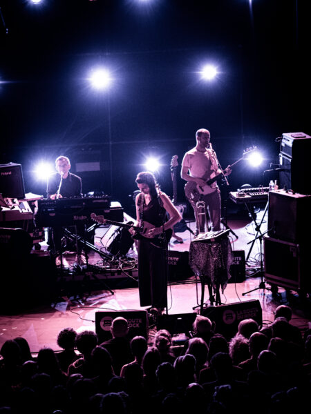 Lorsque Stereolab monte sur scène, la salle est déjà plongée dans une atmosphère attentive. Une des figures de l’indie depuis les années 1990, le groupe franco-britannique reste une référence pour son mélange unique de pop, krautrock et expérimentations électroniques.